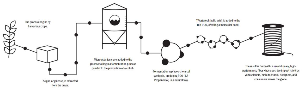 The production by using the biochemical SORONA polymer has the following three environmental value: