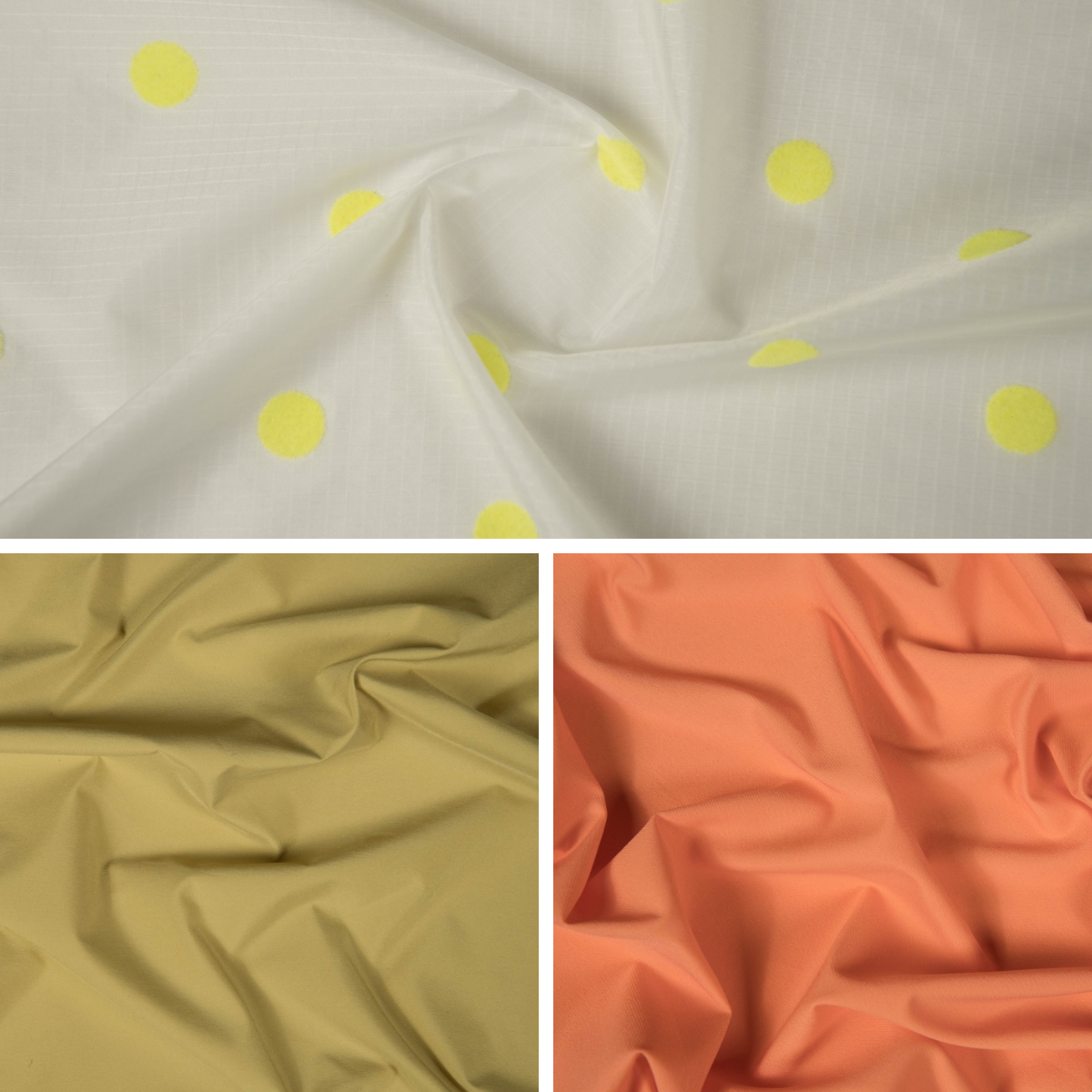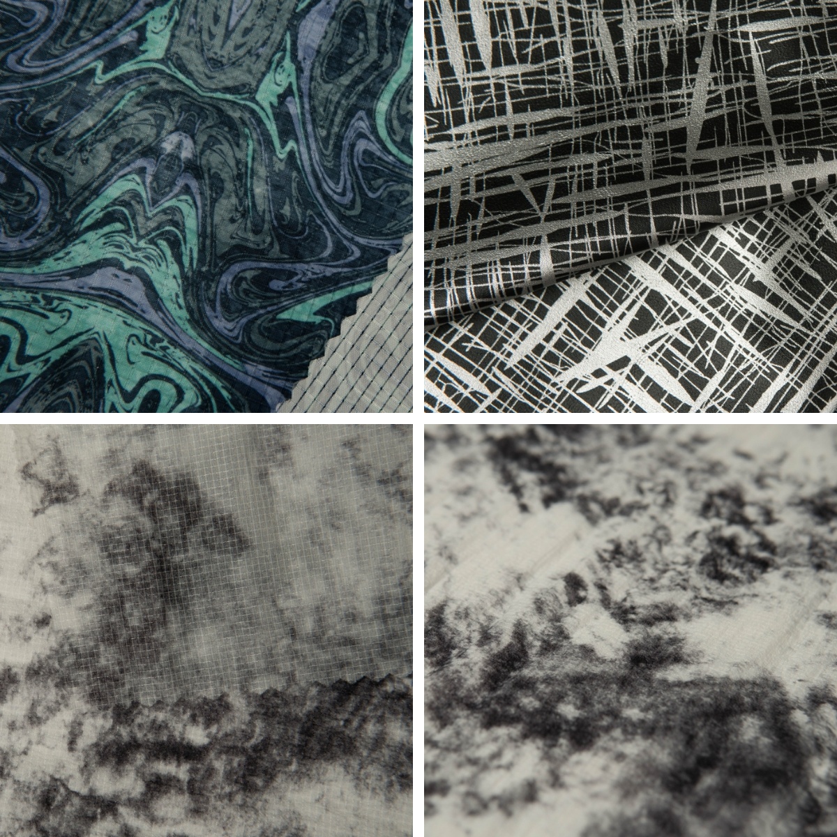 這種面料表面呈現高飽和色彩和圖案,給人一種輕松愉悅的感覺。此面料具有吸濕透氣,防風防水,抗菌抗病毒等特點。再配上趣味性設計使得整體清新明亮,做出的服裝容易讓人眼前一亮。