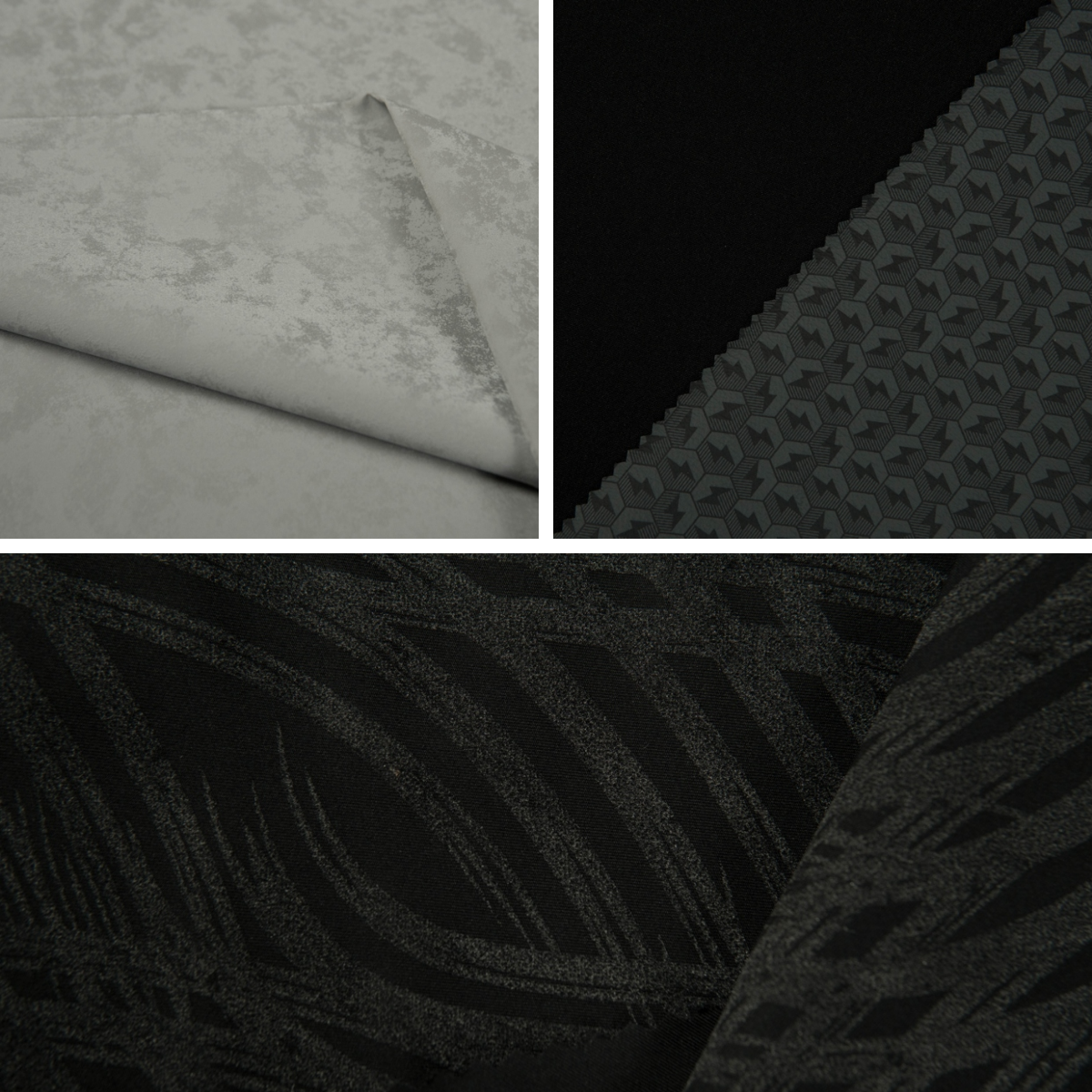 這種面料具有一定的彈力和防水力,耐水洗,面料不易變形。此種面料表面呈現出一種未來科技風的圖案,有虛擬科技驅動感、虛擬疊影以及流光漸變等效果。色彩偏暗沉復古,服飾整體厚重,大氣。