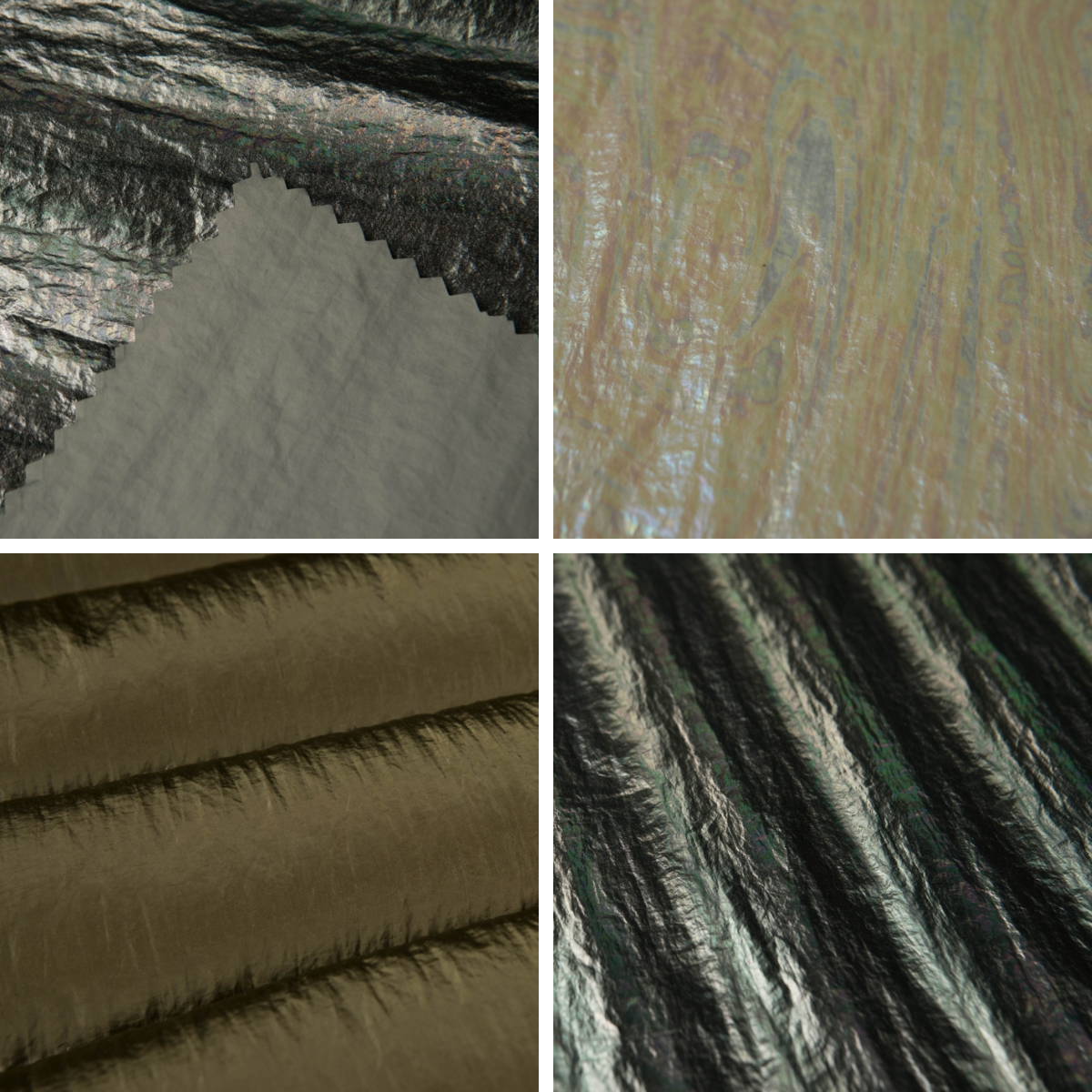 這種面料運用了涂層、壓花、燙金等一種或多種組合工藝使得外觀呈現漸變或散射的虹彩,表面光滑有緞面光澤。面料硬挺,可塑性高,而且具有很好的耐磨性。