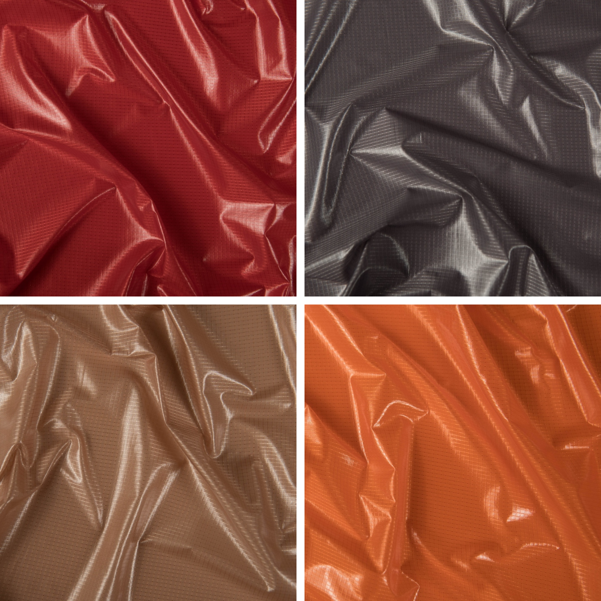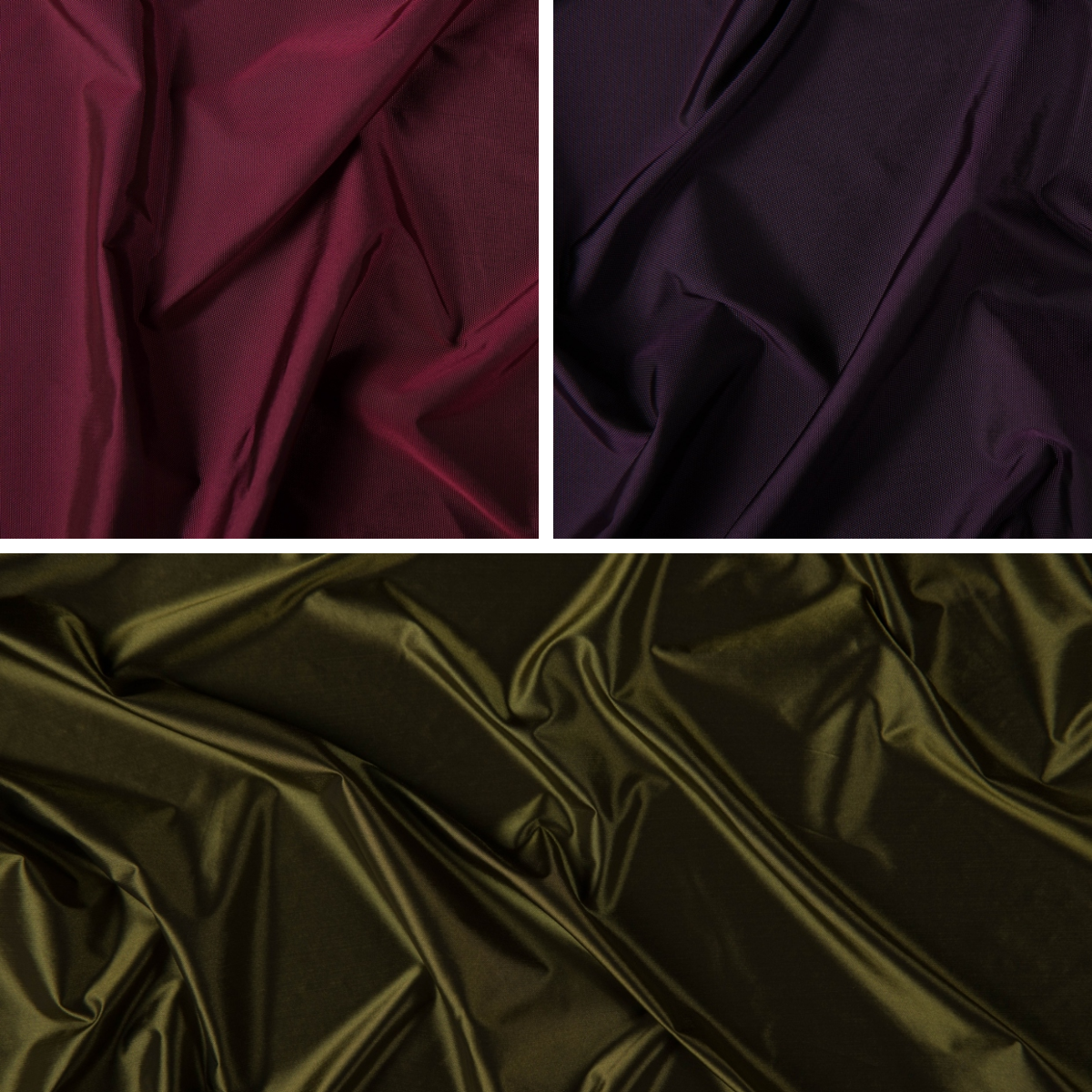 這種面料因為表面有涂層,所以會顯現出仿皮質地和復合肌理。色彩飽滿多樣,琳瑯滿目,有光線照射時出現油潤的效果,絢麗奪目,而且具有一定的防水性。