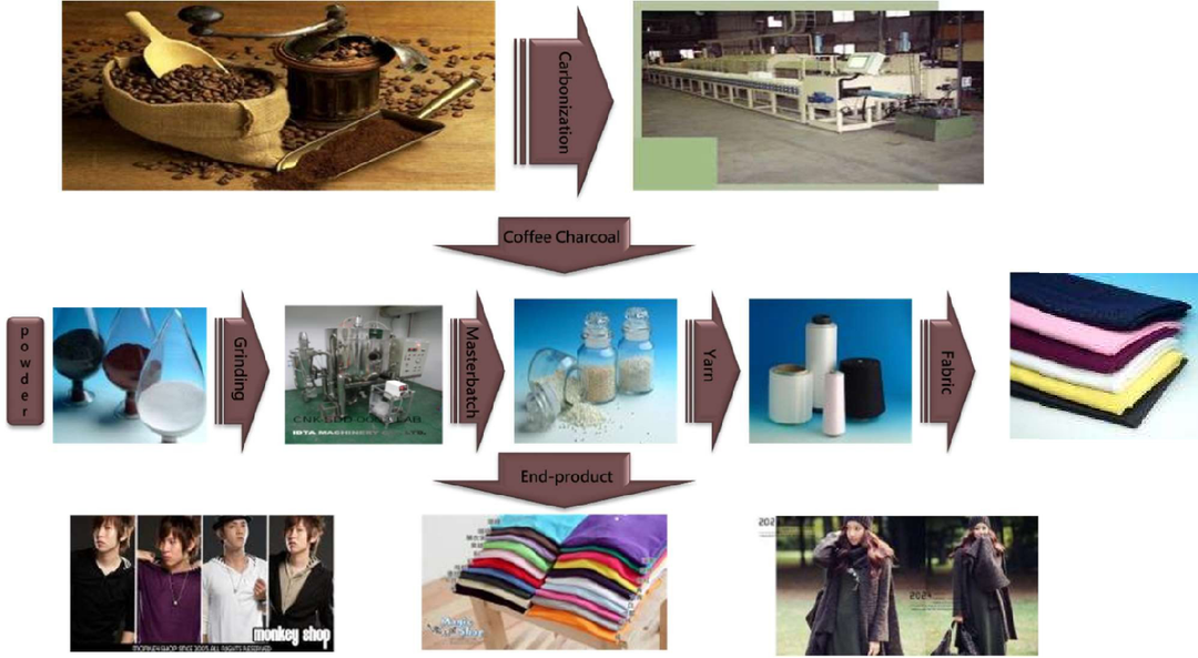 太陽(yáng)絲(咖啡碳纖維)是利用喝完咖啡后剩下的咖啡渣,經(jīng)煅燒后制成晶體,再研磨成納米粉體,加入到滌綸纖維中,生產(chǎn)出的一種功能性滌綸纖維。