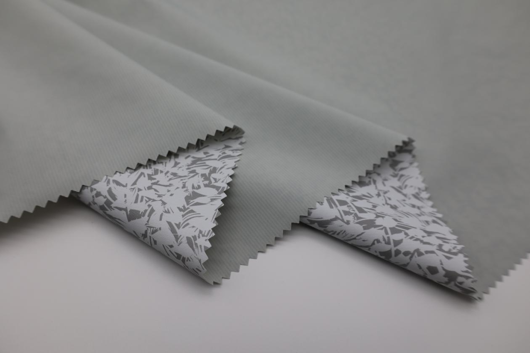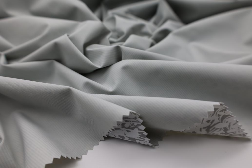 后經過環保工藝將印花膜與之覆合到一起,在兼具基布特點同時又增加了高耐水壓、高透濕、防絨等優良性能,更是將內里花膜的花紋在布的正面隱隱反襯出來,更增加了一種朦朧的科技感與神秘感,讓人不自覺沉迷其中;