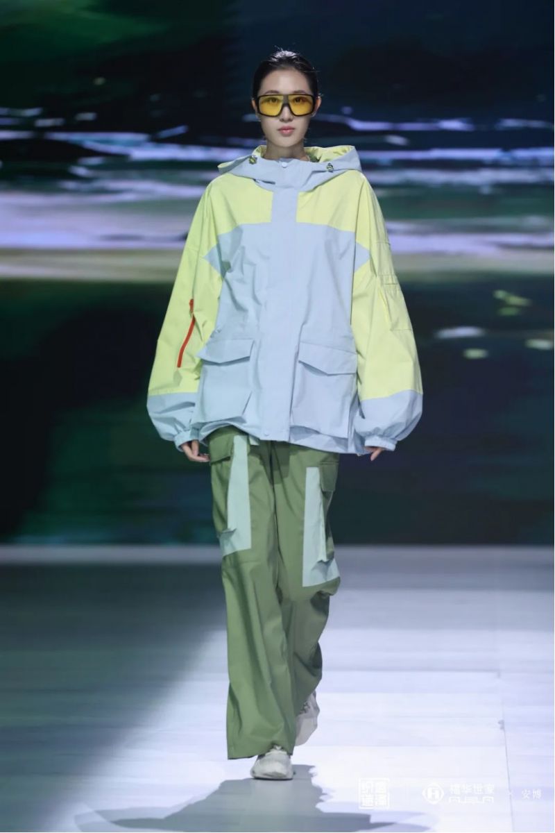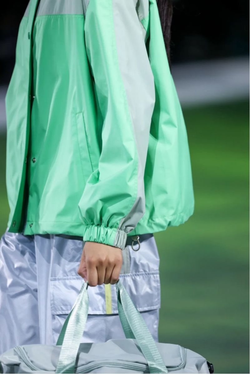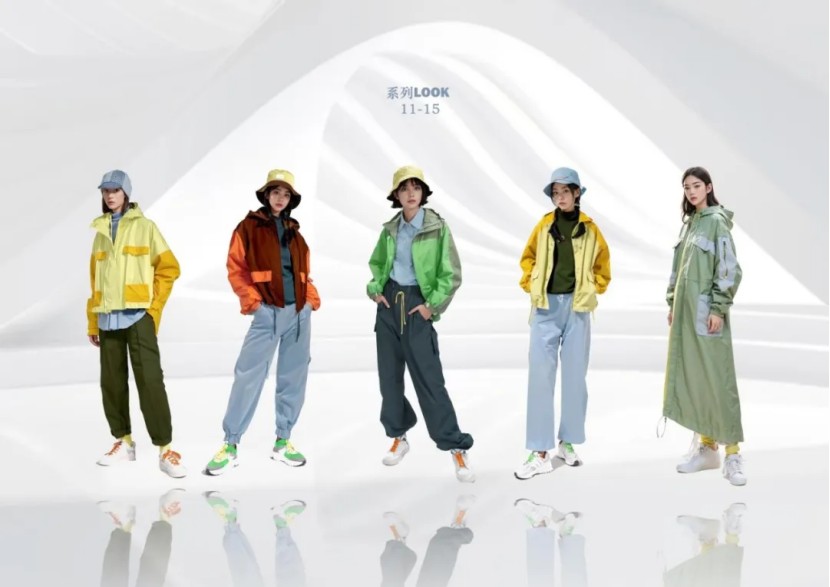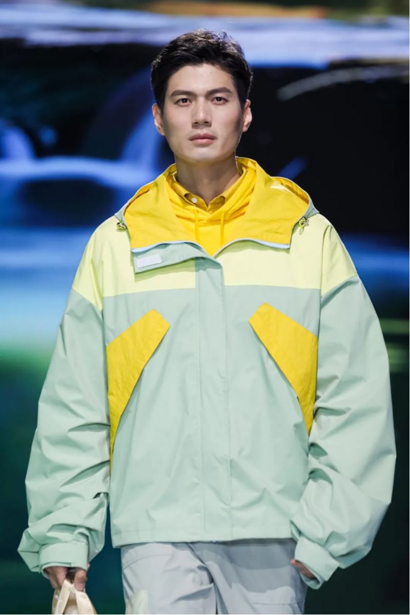 本系列設(shè)計色彩取之于自然萬物中的天、地、水、植,例如嫩芽黃、萊姆綠、香水藍(lán)等等。同時在面料上的選擇也考慮到了不同溫度環(huán)境下的穿著體驗,包括不同克重的錦綸、滌綸面料,同時考慮到了環(huán)保因素,一部分漁網(wǎng)回收的錦綸同樣運用到了此系列中。通過色彩與面料的巧妙搭配,讓本系列整體風(fēng)格顯得明快自然、舒適閑逸,通勤與戶外的有機結(jié)合,也讓此類輕戶外風(fēng)格更能得到當(dāng)下消費者的青睞。